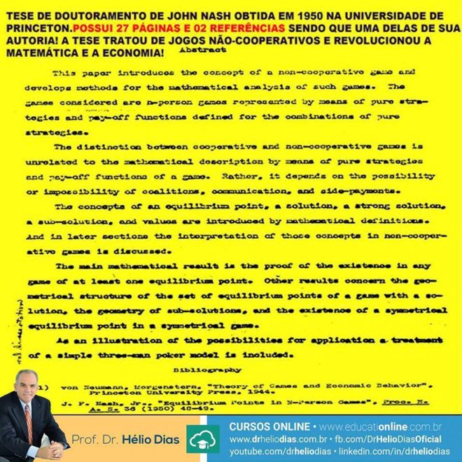 John Forbes Nash Jr. faleceu em 23 de maio de 2015. Foi um matemático norte-americano que trabalhou com teoria dos jogos, geometria diferencial e equações diferenciais parciais, servindo como Matemático Sénior de Investigação na Universidade de Princeton. Aos doze anos, começou a realizar algumas experiências científicas em seu quarto; nessa época, era bastante evidente seu gosto pela solidão, pois preferia fazer as coisas sozinho a estar em contato e trabalhar em grupo.Nash também foi conhecido por ter tido sua vida retratada no filme Uma Mente Brilhante, vencedor de quatro Óscars (indicado para oito), baseado no livro-biográfico homônimo, que apresentou seu gênio para a matemática e sua luta contra a esquizofrenia.