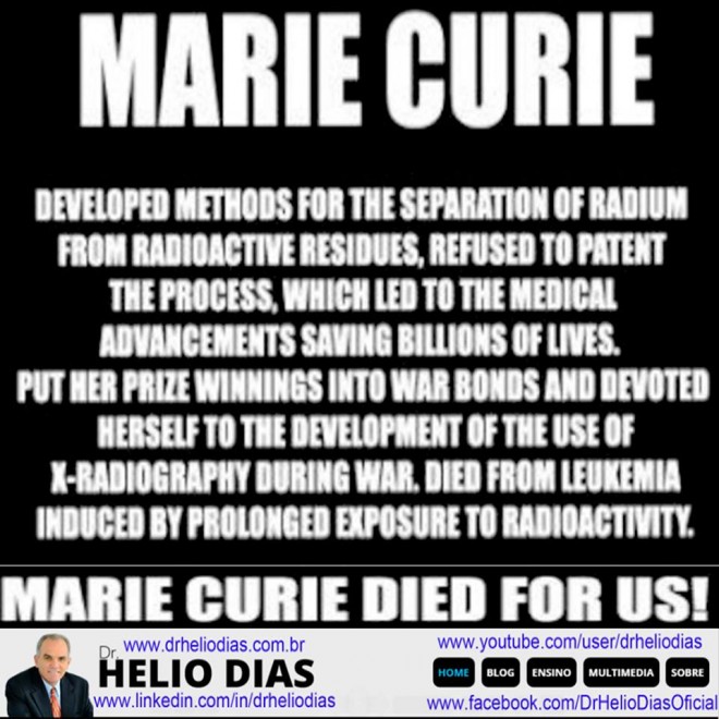 Marie Curie morreu em 04 de Julho de 1934 de leucemia! Foi a primeira pessoa a ser laureada duas vezes com um Prêmio Nobel, de Física, em 1903 pelas suas descobertas no campo da radioatividade e com o Nobel de Química de 1911 pela descoberta dos elementos químicos rádio e polônio. Veja o vídeo Mulheres