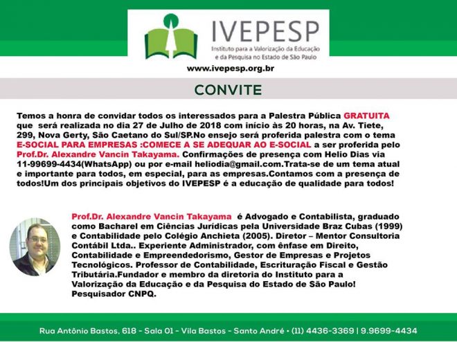 PALESTRA GRATUITA SOBRE E-SOCIAL PARA EMPRESAS SERÁ EM 27/07/2018(INSCREVA-SE)